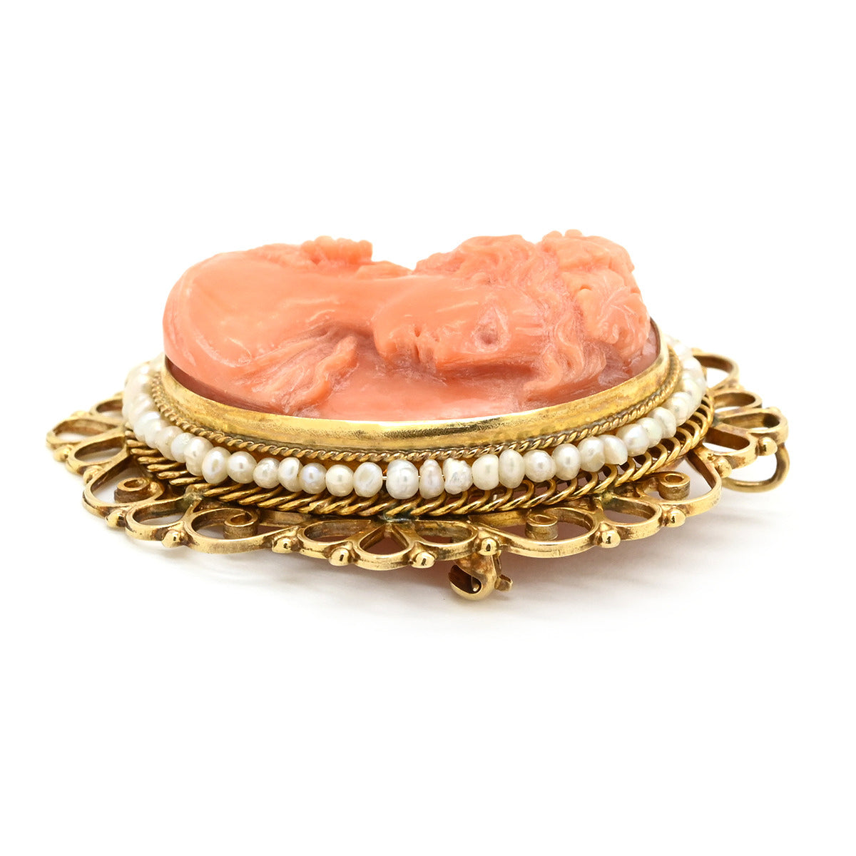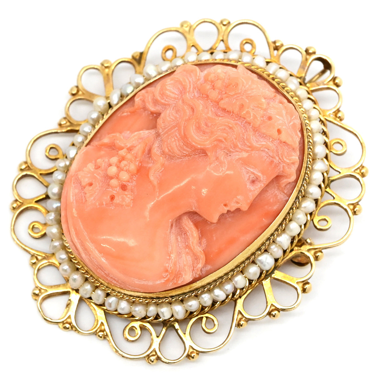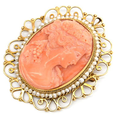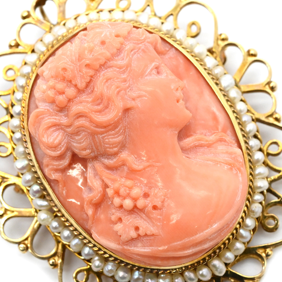 ノンブランド NON BRAND カメオ イエローゴールド×パールホワイト K14YG 珊瑚(コーラル) ブローチ 肖像 彫刻 小粒パール×珊瑚 ペンダントトップ