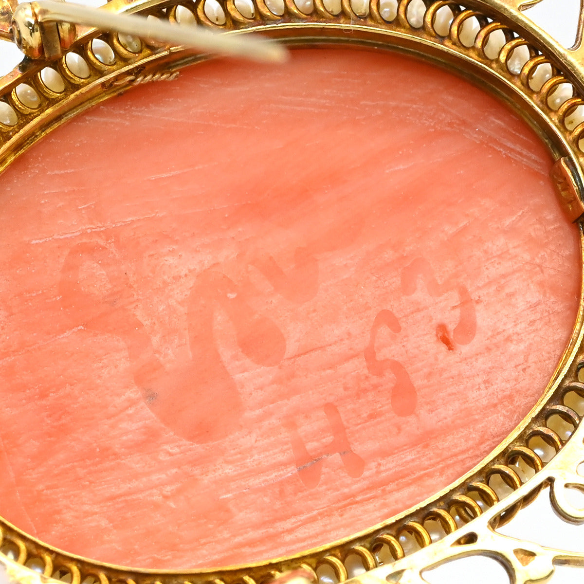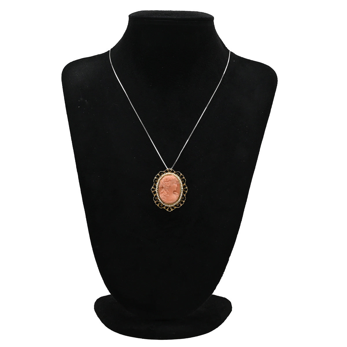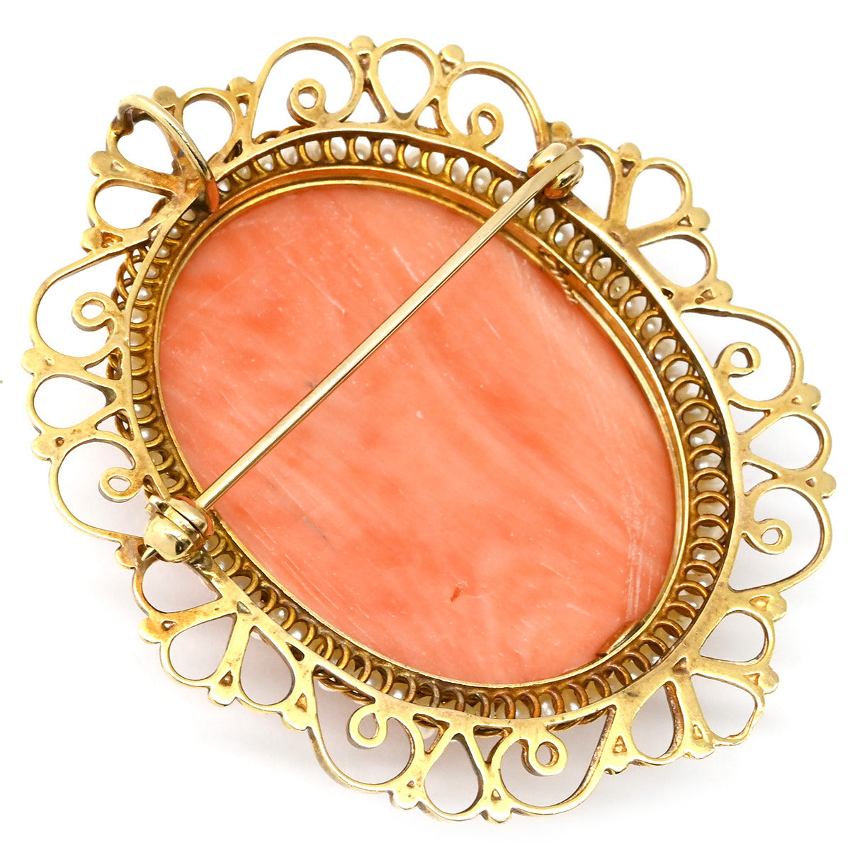 ノンブランド NON BRAND カメオ イエローゴールド×パールホワイト K14YG 珊瑚(コーラル) ブローチ 肖像 彫刻 小粒パール×珊瑚 ペンダントトップ
