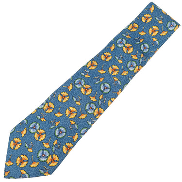 エルメス HERMES 植物柄 9cm ブルー×マルチカラー シルク ネクタイ 青 イチョウ 花 葉っぱ