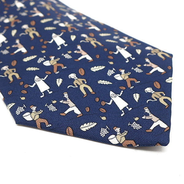 エルメス HERMES 果物狩り 落ち葉 9cm ブルー×ブラウン シルク ネクタイ 青 茶 ベージュ 総柄 ぶどう ピープル